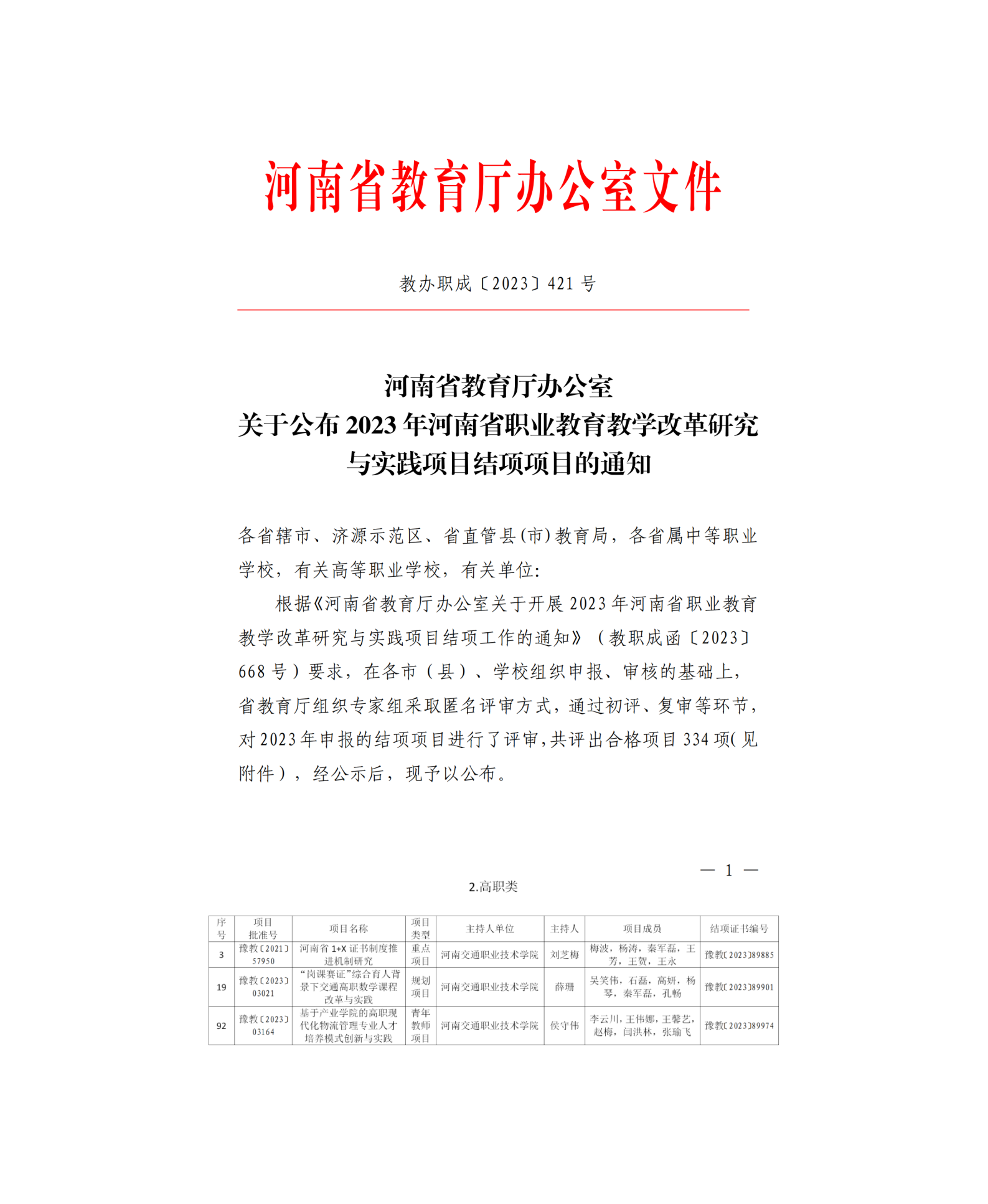 近日,河南省教育厅办公室发布了《关于公布2023年河南省职业教育教学改革研究与实践项目结项项目的通知》(教办职成〔2023〕421号),我校《河南省 1+X 证书制度推进机制研究》《“岗课赛证”综合育人背景下交通高职数学课程改革与实践》《基于产业学院的高职现代物流管理专业人才培养模式创新与实践》3个项目顺利通过验收结项。