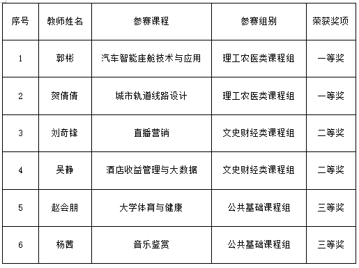 近日,河南省教育厅印发《河南省教育厅办公室关于公布2023年河南省高等职业教育课堂教学创新大赛获奖名单的通知》(教办职成〔2023〕444号),我校教师荣获一等奖2项,二等奖2项,三等奖2项。