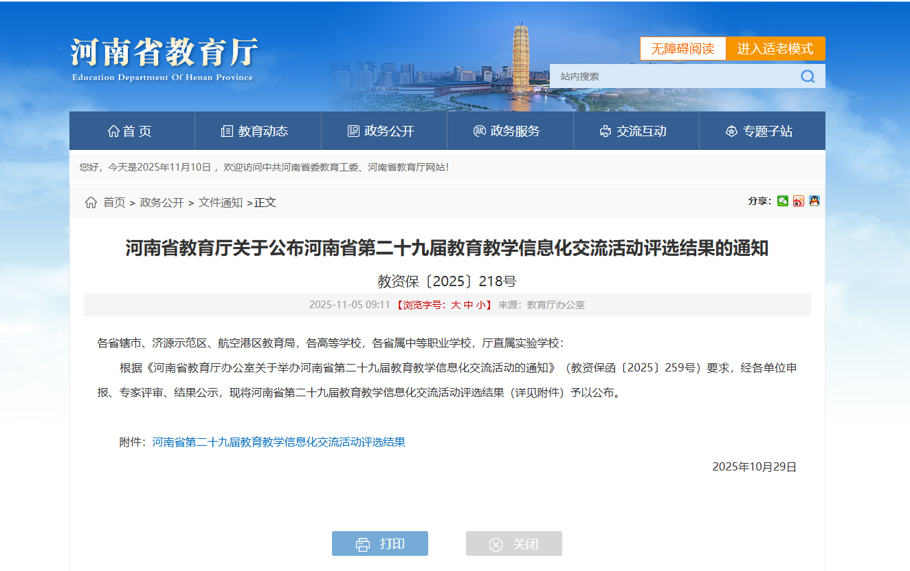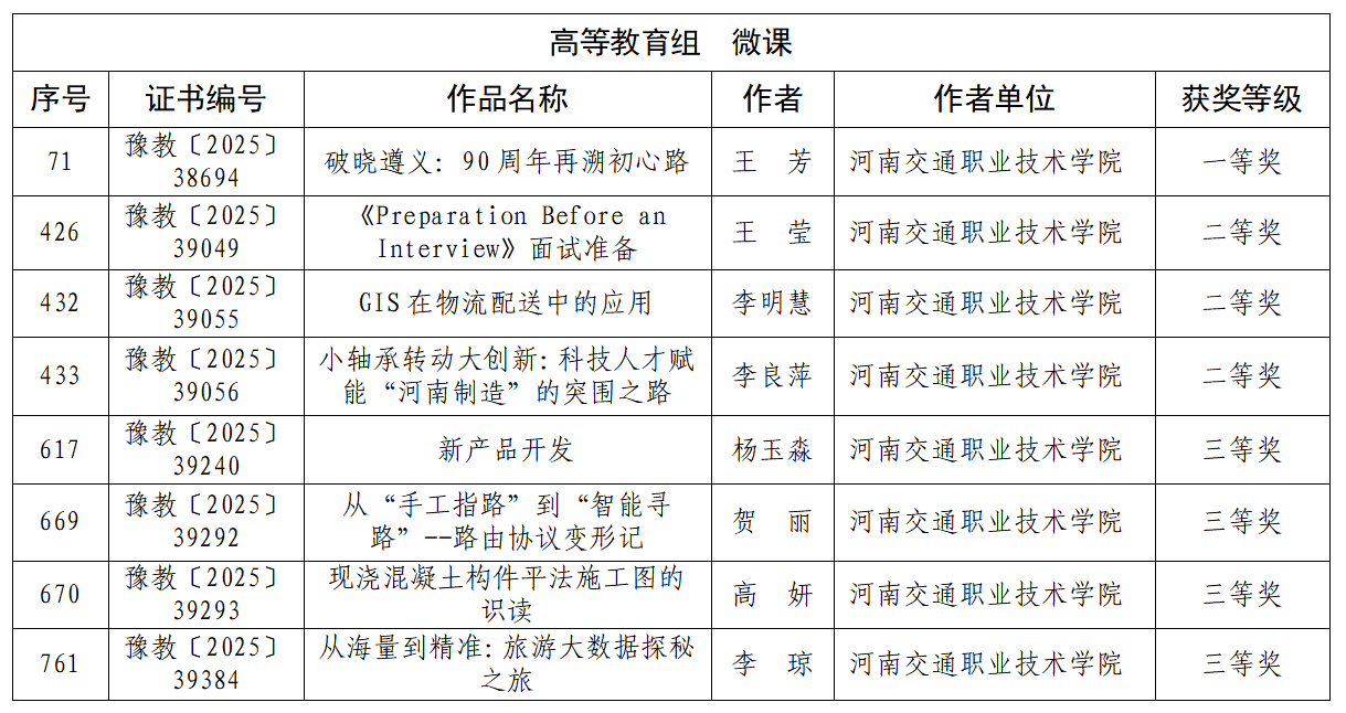 近日,河南省教育厅发布《关于河南省第二十九届教育教学信息化交流活动评选结果的公示》,我校在此次比赛高等教育组中荣获一等奖3项、二等奖3项、三等奖6项。