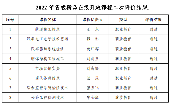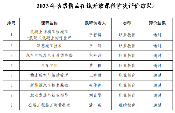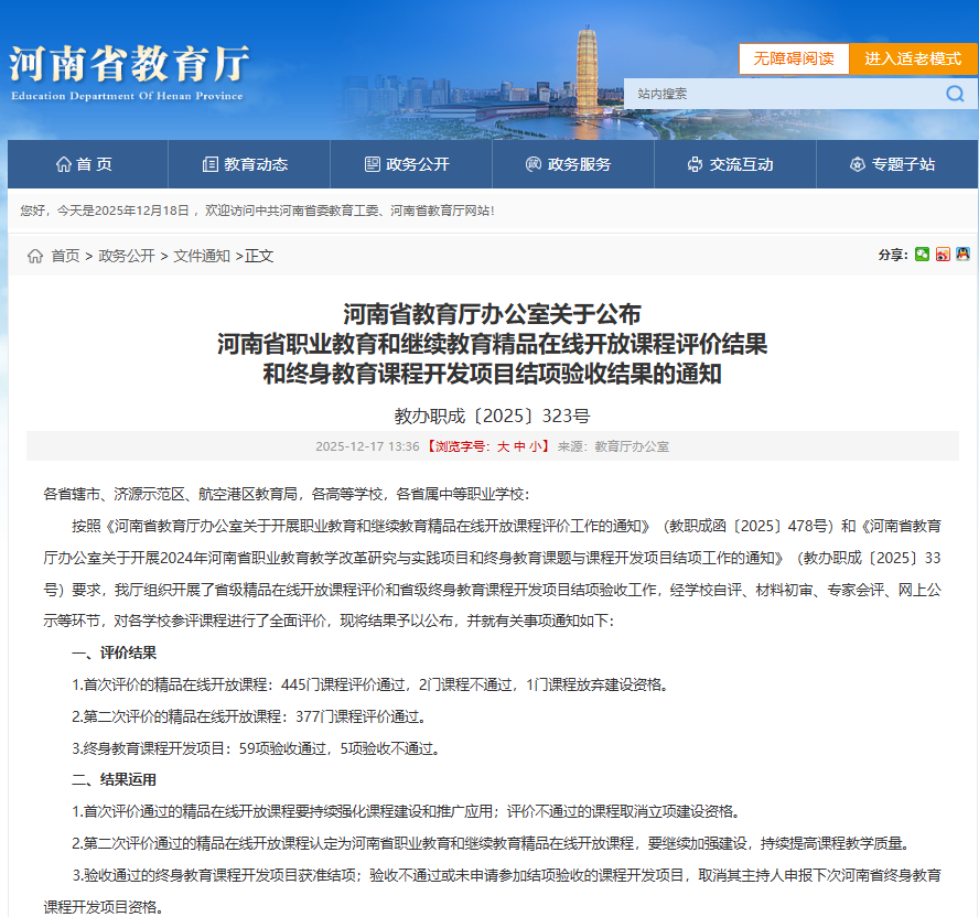 近日,河南省教育厅办公室公布了河南省职业教育和继续教育精品在线开放课程评价结果和终身教育课程开发项目结项验收结果,我校16门省级精品在线开放课程全部通过评价,其中2023年立项的8门课程通过首次评价,2022年立项的8门课程通过二次评价。